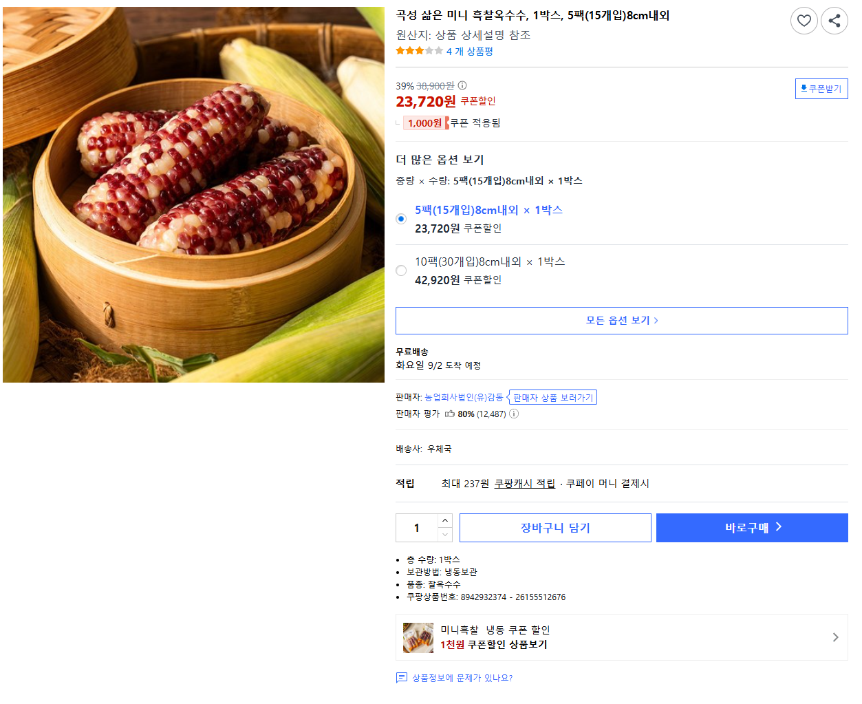 곡성 삶은 미니 흑찰옥수수, 10팩(30개입)8..., 1박스 - 옥수수 | 쿠팡